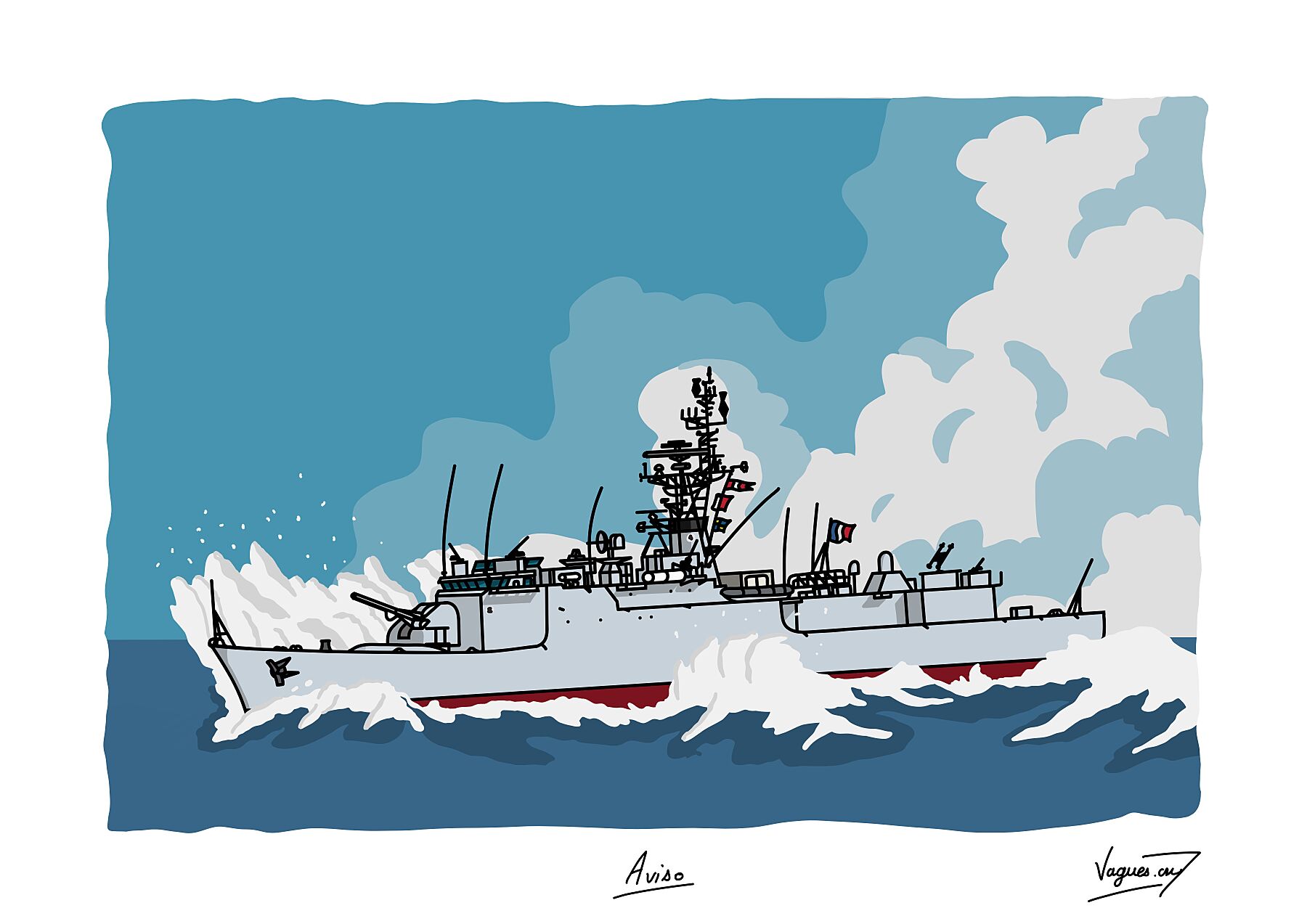 Cette illustration originale rend hommage à l’aviso de classe D’Estienne d’Orves, ici représenté dans sa version syracusée. Elle parle aux anciens. Elle parle aux veilles de quart passées sous le vent, aux mains calleuses qui savent lire une mer qui change.