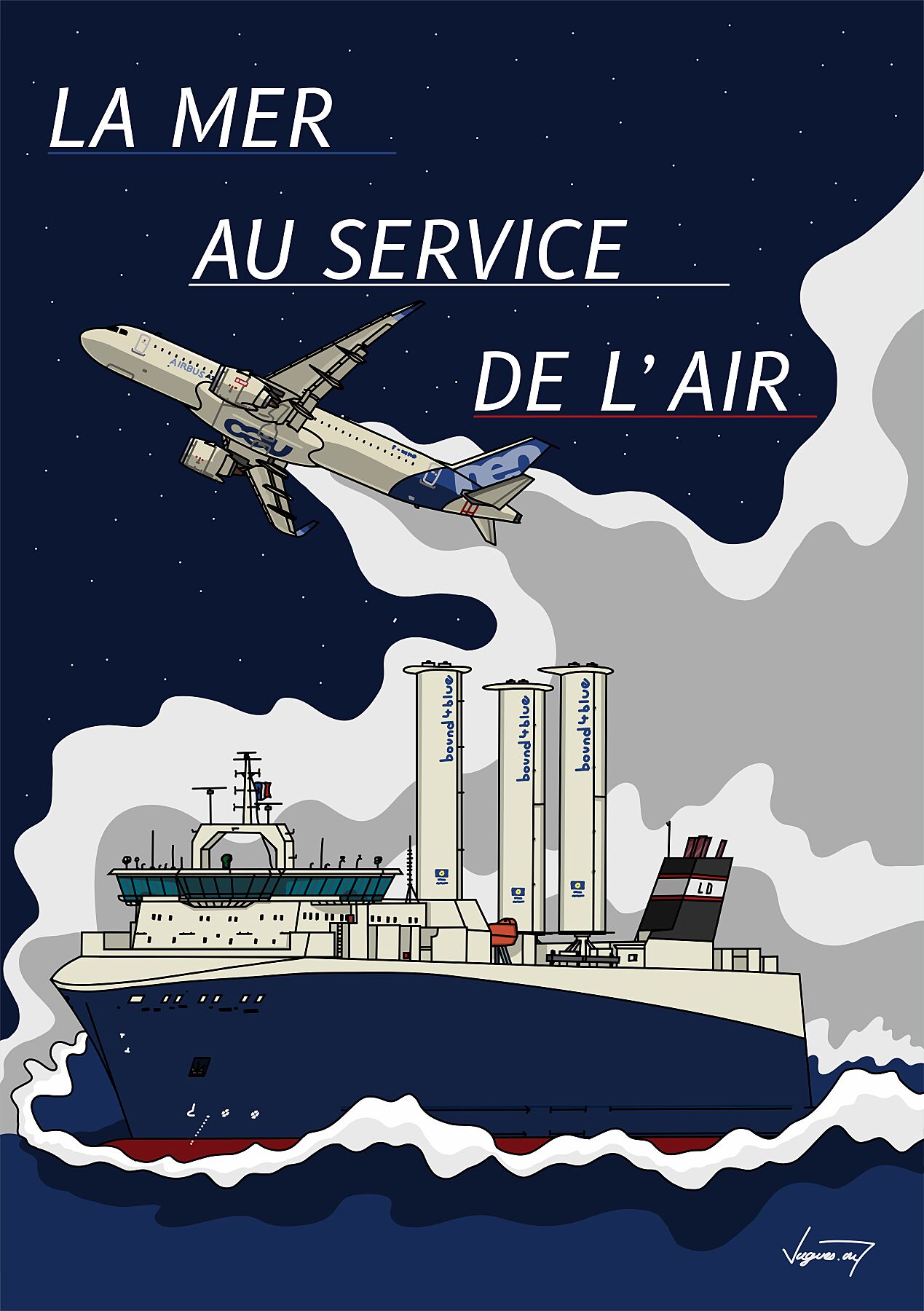 Le croisement entre ces deux géants, maritime et aérien, raconte une épopée logistique contemporaine, une chorégraphie entre ciel et mer, entre ingénierie navale et savoir-faire aéronautique. L’illustration transpose cette réalité industrielle dans une composition équilibrée, qui souligne le rôle clé du transport maritime dans l’assemblage aérien.