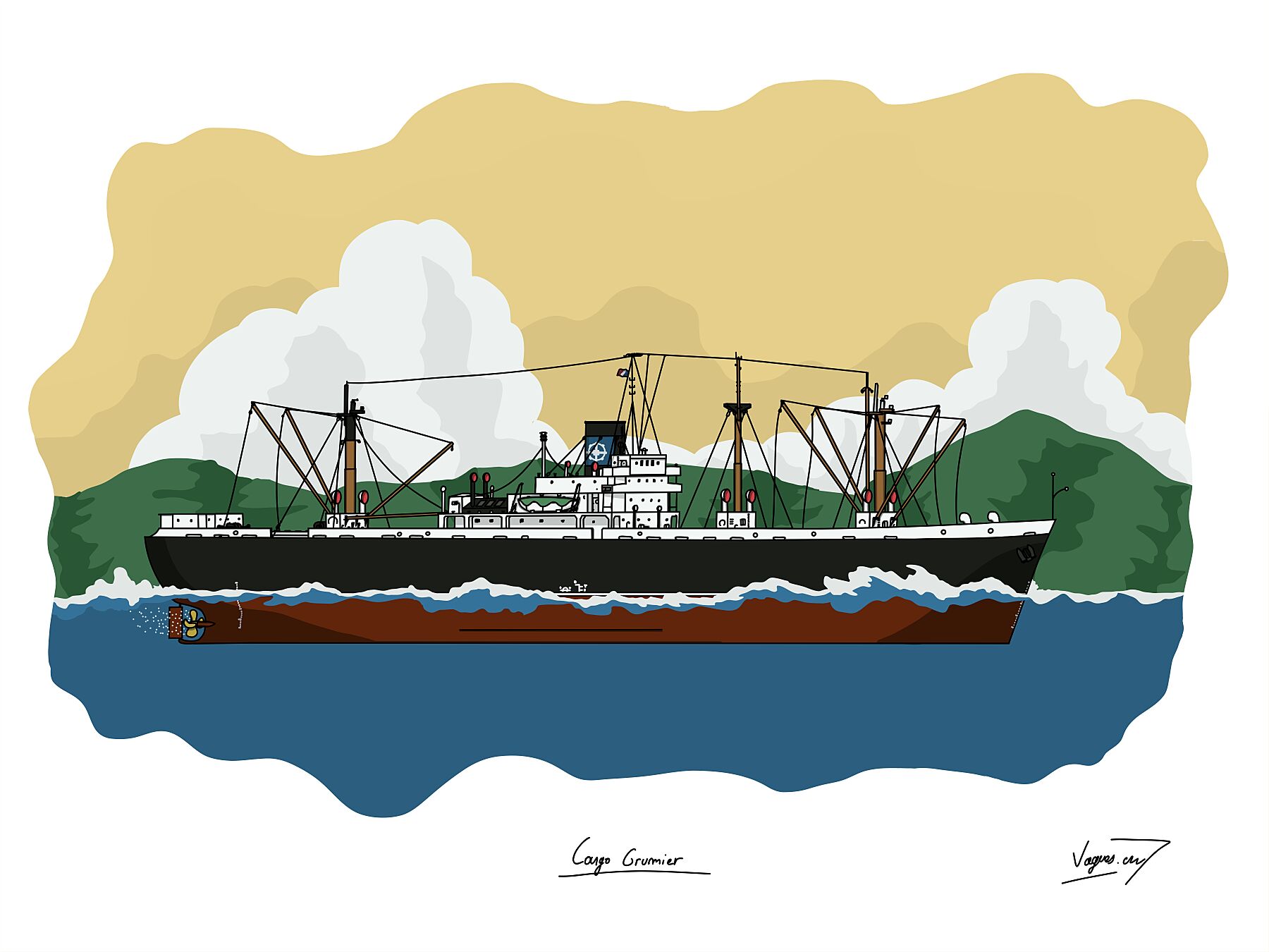 Cette illustration rend hommage à un Liberty Ship français, symbole des efforts maritimes pendant et après la Seconde Guerre mondiale. Le modèle représenté est un grumier de la compagnie Delmas, actif dans le transport du bois et des marchandises entre ports français et internationaux.