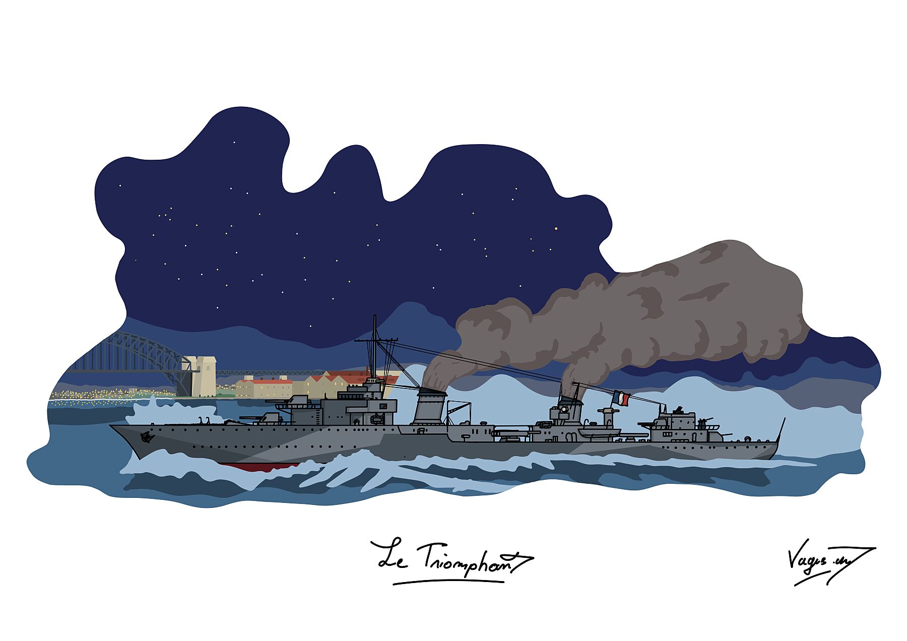 Cette illustration met en scène le contre-torpilleur Le Triomphant, célèbre navire ayant servi dans les Forces Navales Françaises Libres (FNFL). Il voguait au large du port de Sydney. Sa silhouette se détache devant le pont emblématique de la baie, symbole du dynamisme et de la modernité de la ville.