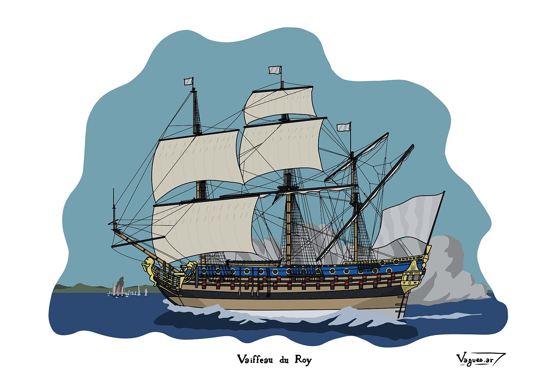Le style épuré met l’accent sur la silhouette et les volumes. De plus, les aplats de couleurs apportent une lecture claire et contemporaine, tout en respectant l’esthétique classique des vaisseaux du XVIIᵉ siècle.